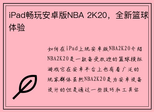 如何在iPad上玩安卓版NBA 2K20 介绍 NBA 2K20是一款备受欢迎的篮球模拟游戏,它在安卓平台上也有着广泛的玩家群体。虽然NBA 2K20是为安卓设备设计的,但是通过一些技巧和工具,你也可以在iPad上畅快地玩耍。本文将为您介绍如何在iPad上玩安卓版NBA 2K20。尊&...